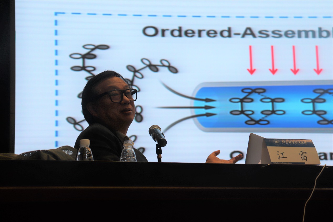 江雷院士从自然界的例子开始,向大家娓娓道来自己对于科学问题独特的思考和研究。电鳗中的发电器件中核心的是钾离子通道,该通道的特点是具有非对称性,可以使得钾离子整流,单方向传输。团队以此为基础,制备仿生纳米仿生膜,材料在发电功率和发电效率方面都显示了独特的优势。基于一系列自然实例,江雷院士创新性地提出量子限域超流体概念。作为对传统理论的挑战,这将开辟量子离子学的新领域,促进能量转换材料体系的发展和应用,颠覆对神经科学和脑科学中神经信号传输等问题的理解;并将推动界面催化化学理论的发展,为化学、化工和合成生物学等领域的未来发展开辟新的道路。在讲座中,江院士深入浅出,生动地讲述了在仿生超浸润界面体系中的探索与发现,还分享了他的人生之路、科研之路,让与会的每一位同学老师都深受启迪。