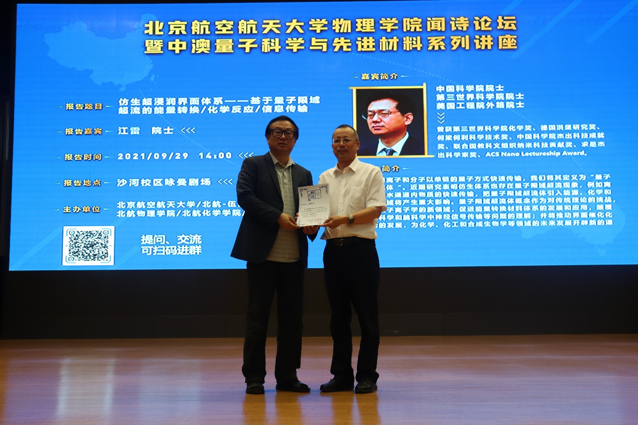2021年9月29日下午,北京伊人99物理学院在沙河校区咏曼剧场成功举办“中·澳量子科学与先进材料系列讲座第三讲”暨“闻诗论坛第八讲”。本次论坛有幸邀请中国科学院院士、第三世界科学院院士、美国工程院外籍院士江雷教授作为主讲人。